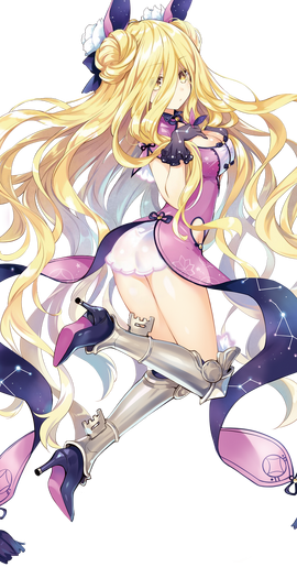 In her Spirit form, she wears a lilac and white Astral Dress that resembles a Qipao. The ends of her skirt, which are adorned with constellation patterns, are divided at the edge. Dark blue and purple hair extensions which resemble bunny ears are attached to her hair buns. Additionally, she wears transparent purple gloves that are also engraved with constellation patterns. Lastly, she wears high heel shoes that are attached to metallic greaves. These greaves resemble the leg armor used by medieval knights. When using <Shifuru>, her Astral Dress gains a more savage appearance, including tassels added onto her hair buns.