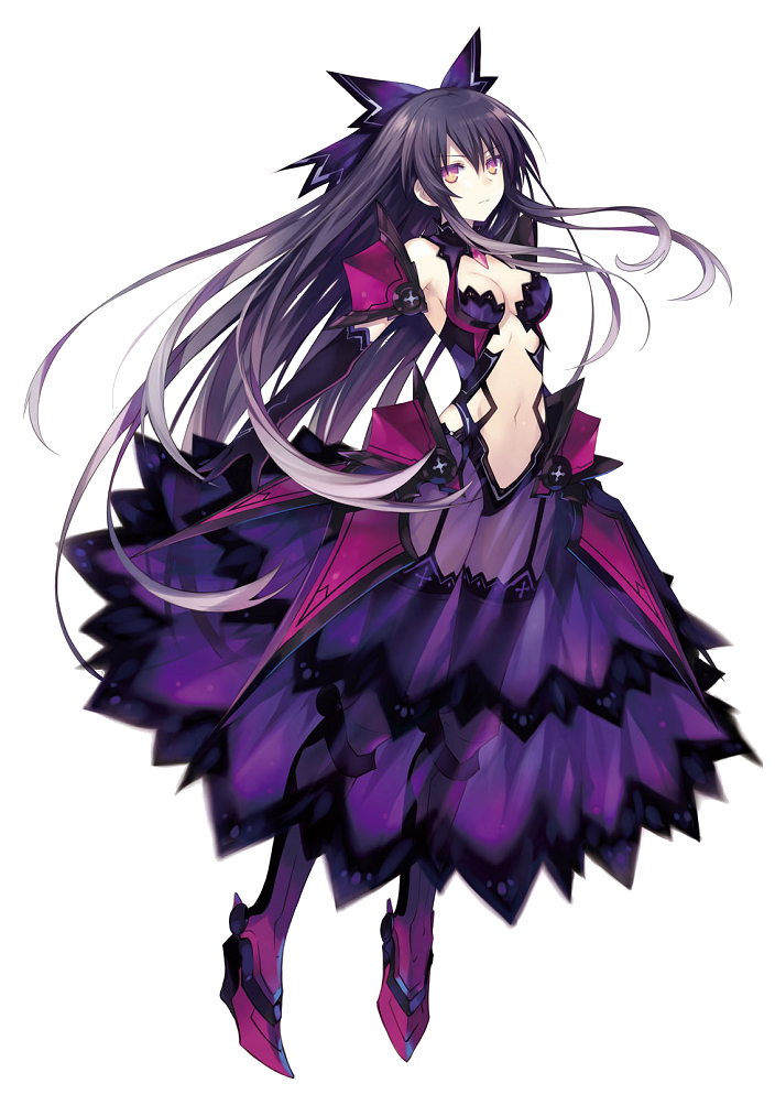 Tohka is a girl with very long, dark purple hair in the same shade as the color of the night. She partially ties it back into a ponytail with a ribbon while still letting much of her hair fall to her knees. Her dark purple eyes are described as crystal-like and have a golden tint. Shido remarks that her beauty is to the extent of almost being violent. Tohka's height is stated to be 155cm, and her three sizes are B84/W58/H83.